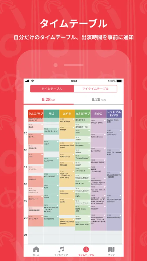 出演日別にタイムテーブルを確認できます。マイタイムテーブルの作成や、出演時間が近づくと通知をしてくれる""リマインダー機能""も。マイタイムテーブルはSNSなどでシェアすることも可能です。