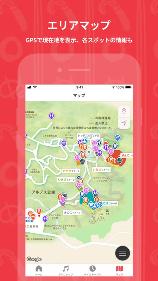位置情報に対応した会場マップ。ステージやトイレ、各ブースの位置と現在地からの距離を瞬時に確認できます。飲食店の情報もここからチェックできます。