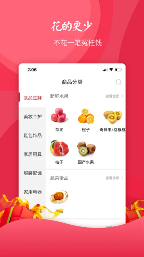 目前app拥有商品5000+,覆盖服装鞋裤、美妆护肤、家电家居、电子数码、日用百货、食品生鲜、保健等各类目,可以满足用户多维度的日常消费需求。