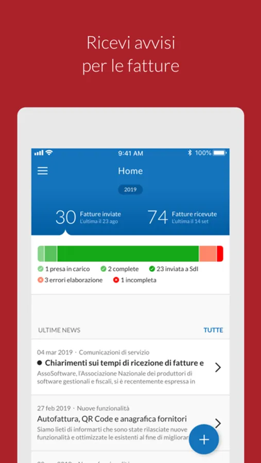 In più potrai sfruttare il vantaggio delle notifiche in app: sarà l’app stessa ad aggiornarti quando riceverai notifiche da parte del SdI relative ai documenti inviati o quando riceverai nuove fatture.