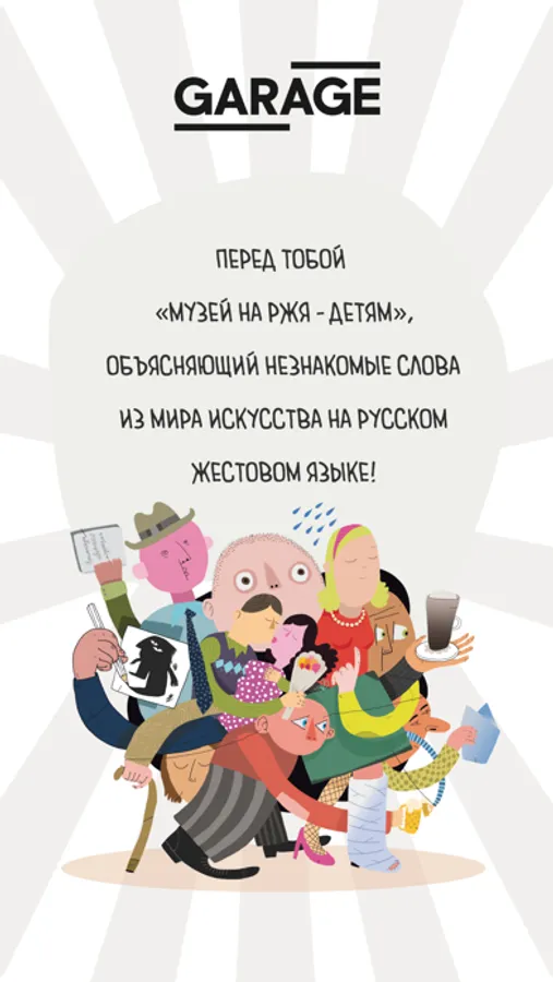 Музей на РЖЯ — детям» — это обучающее приложение с видео и иллюстрациями, из которого дети (самостоятельно или вместе с взрослыми) смогут больше узнать как о Музее «Гараж», так и о мире искусства в целом. Игровая механика приложения делает процесс получения знаний увлекательным для ребенка, а интуитивно понятный интерфейс позволяет пользоваться приложением без помощи взрослых. Каждый термин демонстрируется при помощи коротких видеороликов, где глухие дети рассказывают своим сверстникам об искусстве на жестовом языке. Все видео также подкрепляются интерактивными иллюстрациями. В приложении использованы иллюстрации художника Давида Бёма из книги «Как устроен музей».