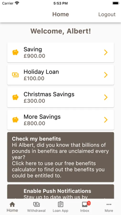 You can view your accounts and their balances, request withdrawals, and search your transactions and use biometrics!