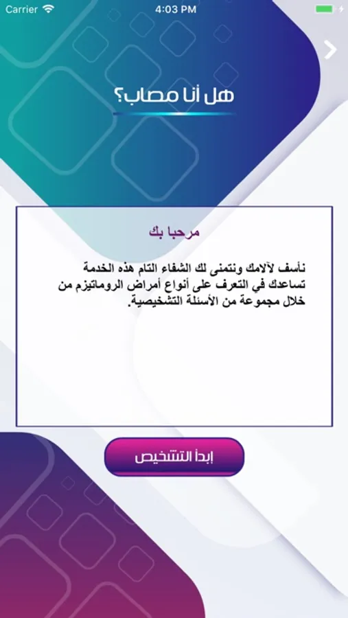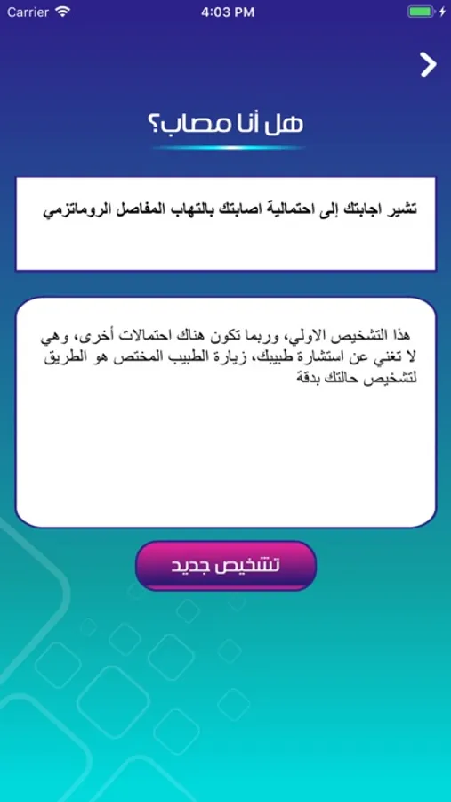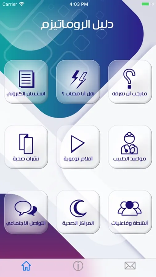 يعمل تطبيق دليل الروماتيزم كمنصة إلكترونية متطورة للتعريف والكشف المبكر لأمراض الروماتيزم والعمل على تجنب المضاعفات المترتبة على الإصابة من خلال التوعية به والتوجيه بإجراء الفحوصات الطبية، وترسيخ السلوكيات والعادات الحياتية السليمة، بالإضافة إلى مجموعة من الخدمات الأخرى مثل الافلام التوعوية ومواعيد مراجعة الطبيب وعناوين المراكز الصحية ومواقع التواصل الاجتماعي وغيرها