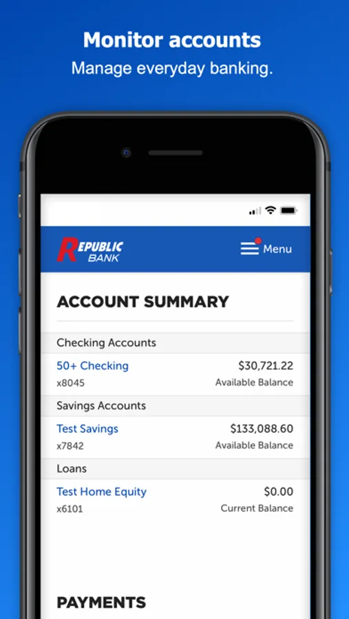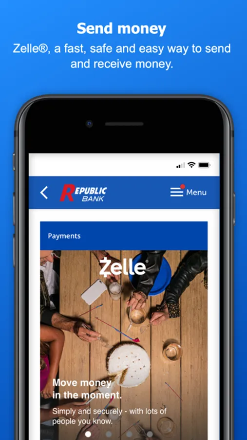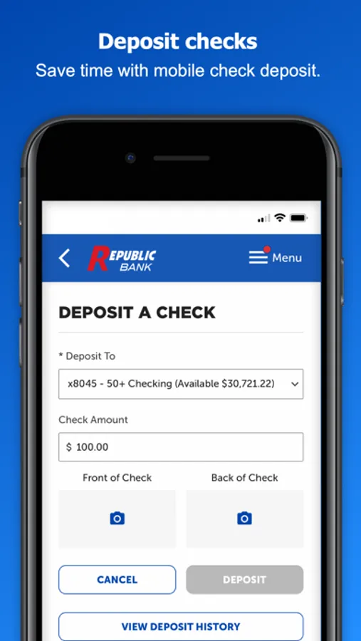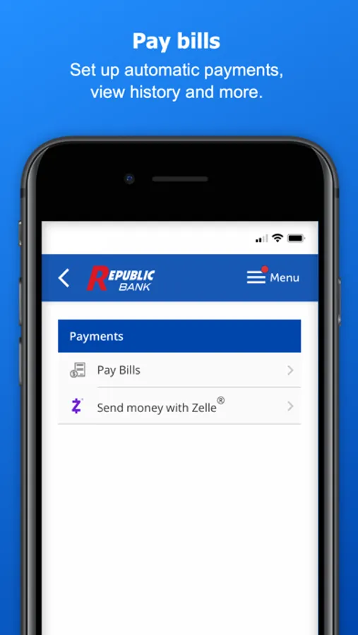 Use the My Republic Bank mobile app to check your balances, pay bills, transfer funds, with just a few taps. You can even activate or freeze your Republic Bank VISA® Debit Card. Connectivity and usage rates may apply, check with your provider for details.