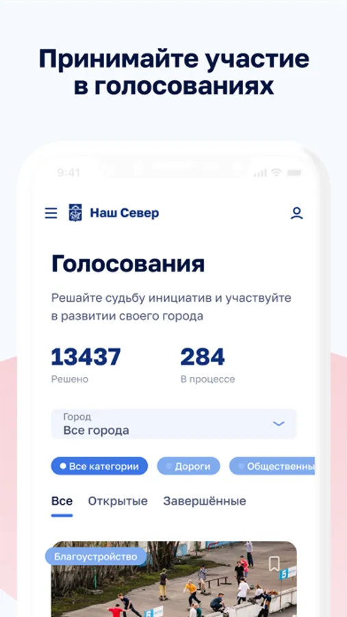 Пройдя короткую регистрацию, вы можете принять участие в открытых голосованиях или сообщить о проблеме в вашем городе, помогая нам развивать, контролировать и своевременно устранять недочеты по состоянию инфраструктуры, проезжей части, освещения, уборке территории и другим вопросам.