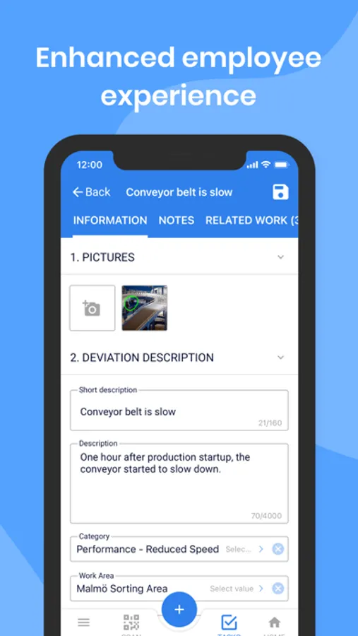 • Deviation Management - Receive deviation notifications, register deviations, add pictures/comments, annotate, instantly see proposed corrective countermeasures, access manuals in Q&A style, search through historical data, use chat function