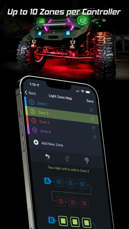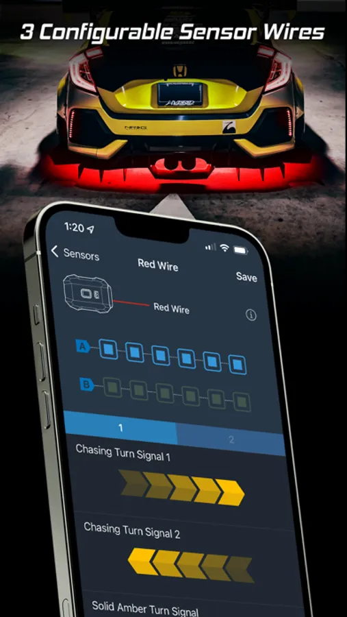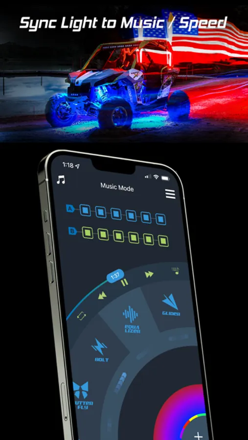 - Sync light to music or speed with equalizer style patterns.