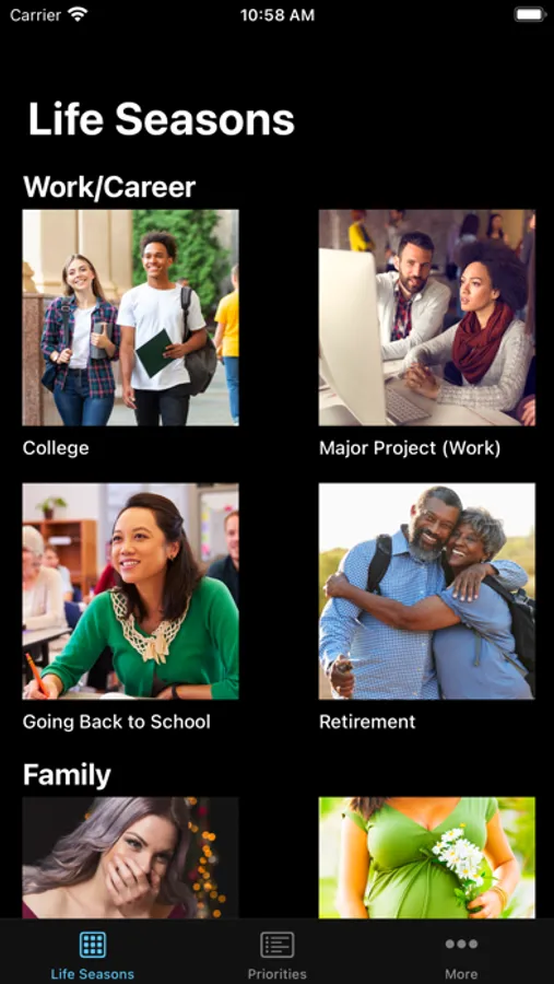 Curated life season themes are provided using beautiful images you select by tapping. Themes are visually grouped by categories such as health, family, and seasons of the year. Examples of included themes: