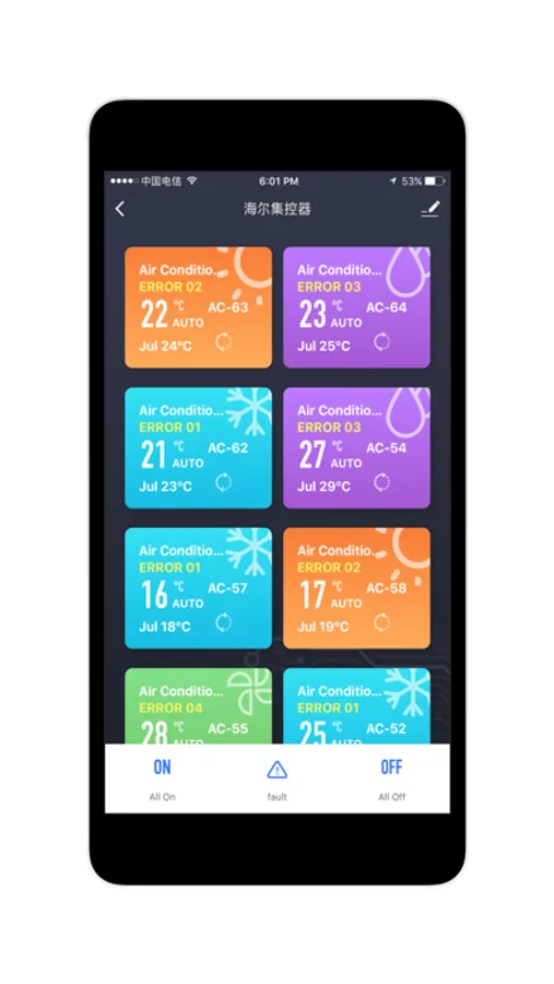 该应用适用于海尔商用空调VRF,Mini VRF,单元机等机型,可实现单个或多个空调设备的远程监控。可以实现多人共享控制同一组空调设备。