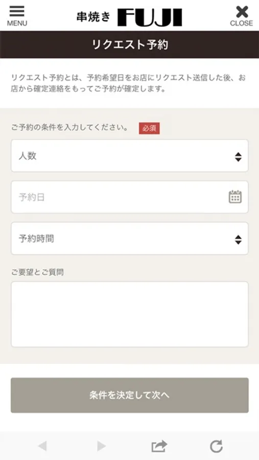 希望の人数・日時を指定して送信するだけで予約を依頼できます。
