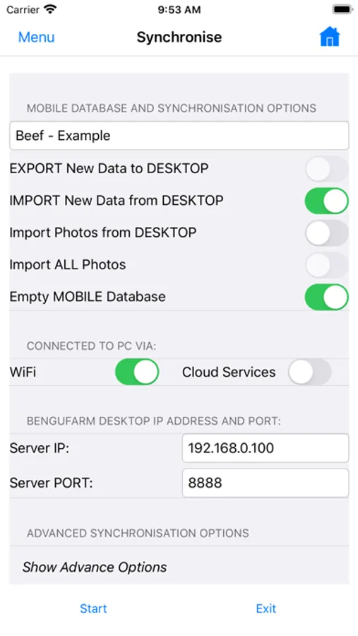 When finished with recording, the information recorded on BenguFarm-MOBILE can be synchronised with the BenguFarm database to bring the data on the PC/laptop(s) up to date. With synchronisation, data recorded in BenguFarm on the PC/laptop is also updated on BenguFarm-MOBILE. Synchronisation of data can be done via Wi-Fi, Internet or a USB connection, depending on which method is available and the method preferred by the user.