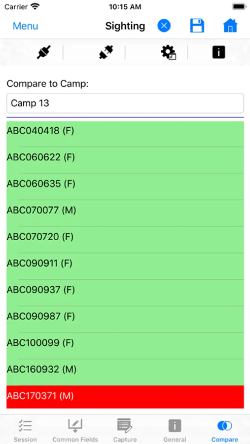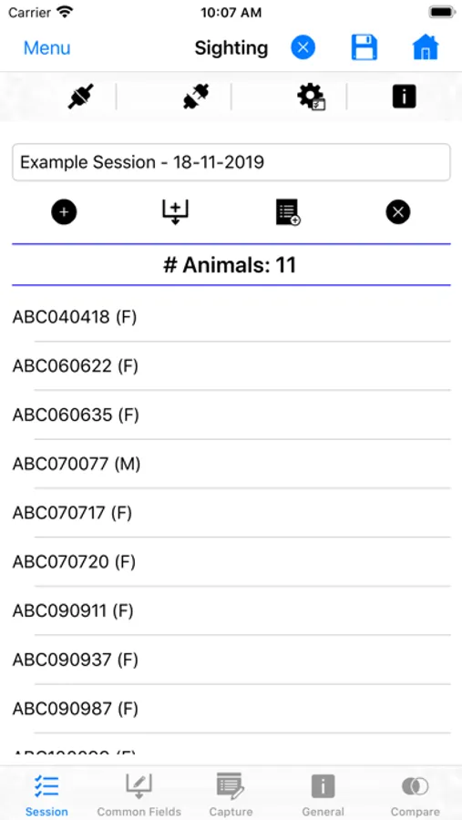 A user may select to enable session recording when capturing data. When a session is enabled, all the animals for which data is captured, are placed in the selected session. Such a session can either be used to capture additional information, by entering the applicable fields and then clicking a single button to create records for all the animals in the session. Secondly the animals in the selected session can be compared to the animals in a camp with differences displayed in a color coded manner.