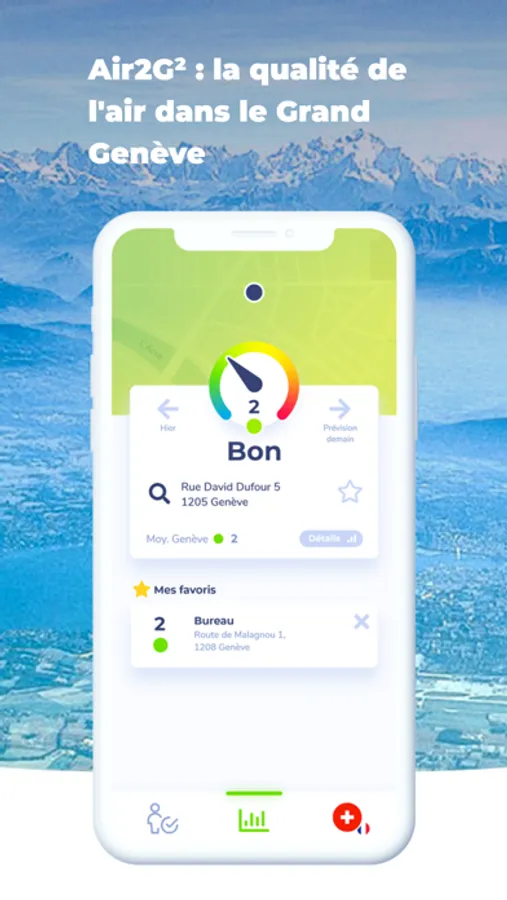 L'application Air2G² est un outil permettant aux utilisateurs d'être informés quotidiennement sur la qualité de l'air au sein du Grand Genève. Les informations sont disponibles sous forme de cartes ou de données provenant de stations de mesures à proximité. Grâce à un système de « switch France-Suisse» l’utilisateur peut choisir, en fonction de sa géolocalisation ou de sa préférence, l’indice journalier de qualité de l’air qui s’affiche sur son écran (échelle suisse ou française). Air2G², c’est aussi des bons gestes recommandés au quotidien en fonction des polluants majoritaires mesurés. Ces bons gestes se transforment en recommandations lors des périodes de vigilance, c’est-à-dire quand les seuils de dépassement sont atteints. En cas de pics de pollution, les mesures à caractère obligatoire (circulation différenciée…) sont aussi indiquées sur l’application.