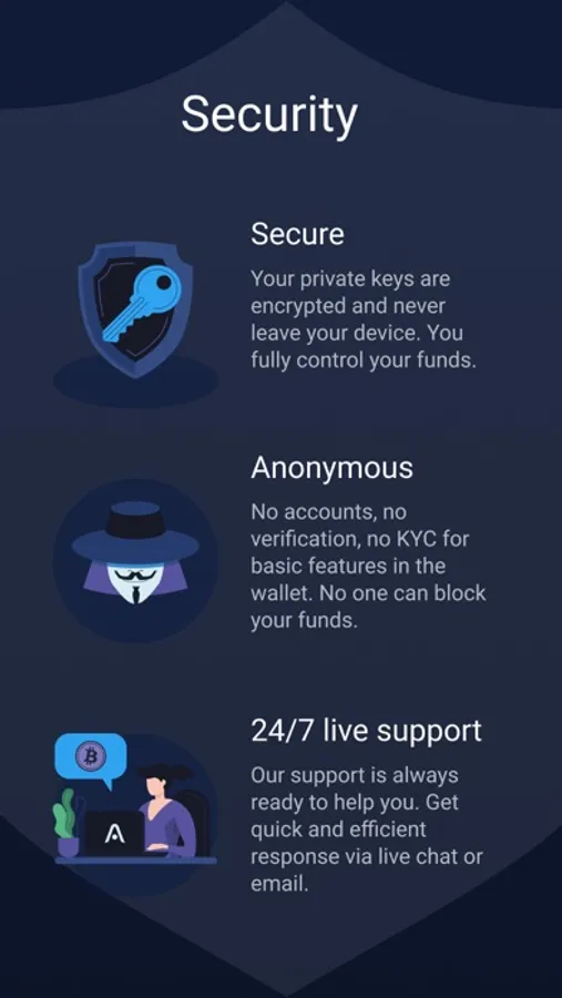 Decentralization and Anonymity: Atomic is a fully decentralized application. We don't store any of your data, don't require any verification for basic services. We never have access to your funds.