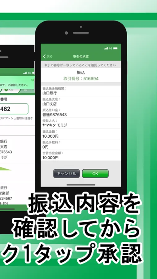 ポータルアプリから行った振込などの取引を、本アプリで確認・認証することで二要素での認証となり、取引の安全性が高まります。