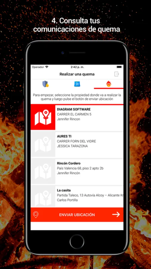 - Solicitar quemas para diferentes propiedades.