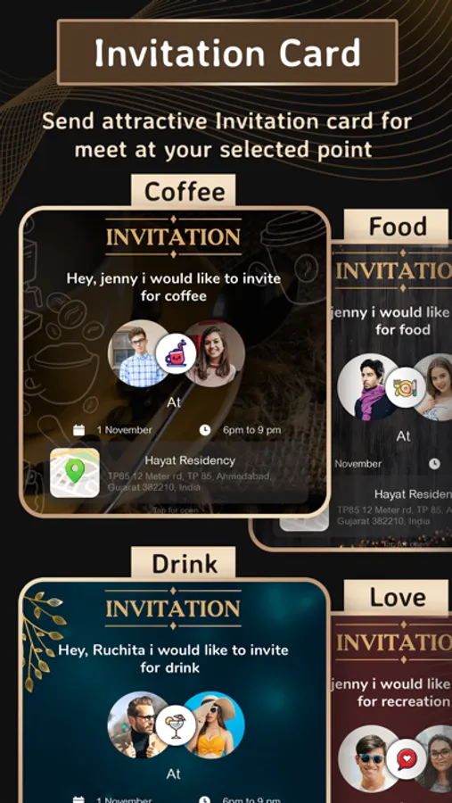 Invite card :— Easily arrange to meet by sending your date an invitation card. Simply select an activity (what) a place (where) and a time (when).