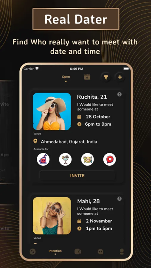 Intention - Set your intentions, let others know when you’re available and your preferred dating activities.