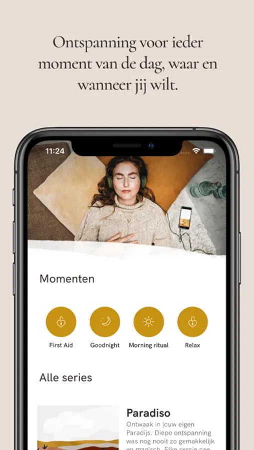 In de vorm van een kort ochtendritueel, een powernap tussendoor of juist tijdens een heerlijke, extra lange avondsessie. We hebben de sessies onderverdeeld in 4 momenten: Morning Ritual, First Aid, Relax en Good Night. Elk moment bevat meerdere sessies variërend van 14 tot 50 minuten.