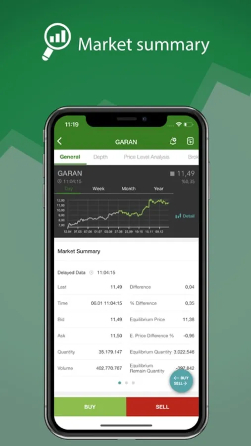 On the new buy/sell screens, you can access the summary market data of the relevant symbol and see your available balance in advance. You can also give your buy/sell orders by specifying the amount instead of the quantity. When you give a sell order for the stock in your portfolio, the quantity field will be filled automatically. You can also access depth information on the buy/sell screen if you have a package for it.