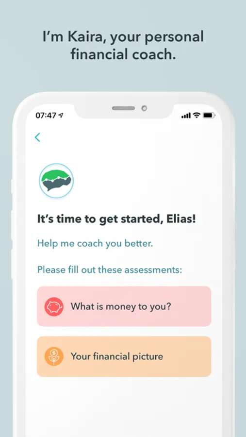 I'm Kaira, your personal financial coach. I take into account what money means to you. And I help you become aware of your financial behaviours. Together, we'll achieve your well-being through financial health and a sense of calm about your money.
