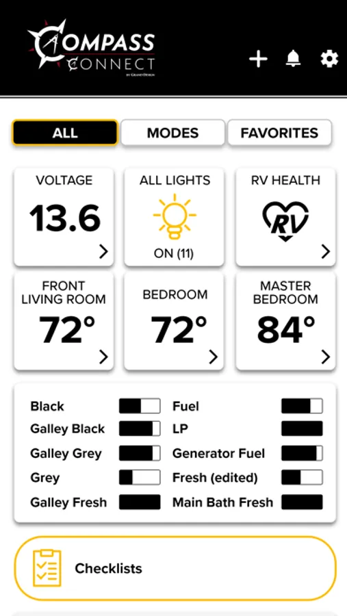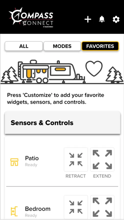 Access and operate essential devices like leveling, lights, slides, awnings and more. Use ‘Modes’ to make a custom device list for each part of your trip or ‘Favorites’ for quick access to frequently used devices.