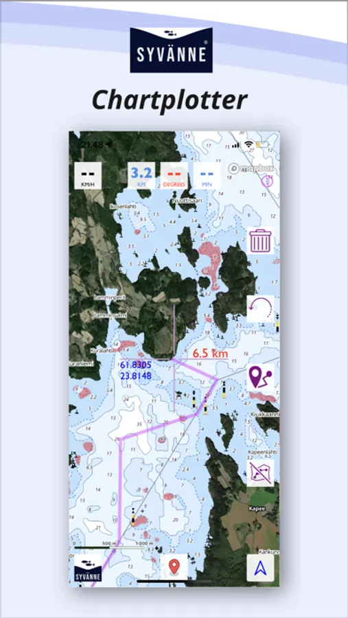 Please always remember to keep official Traficom paper maps with you as the primary navigation tool on the water. The Syvänne chartplotter should not be used as the primary means of navigation. Please remember to always navigate safely on the waters.
