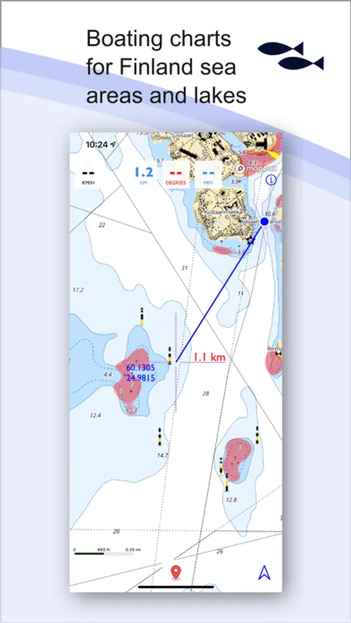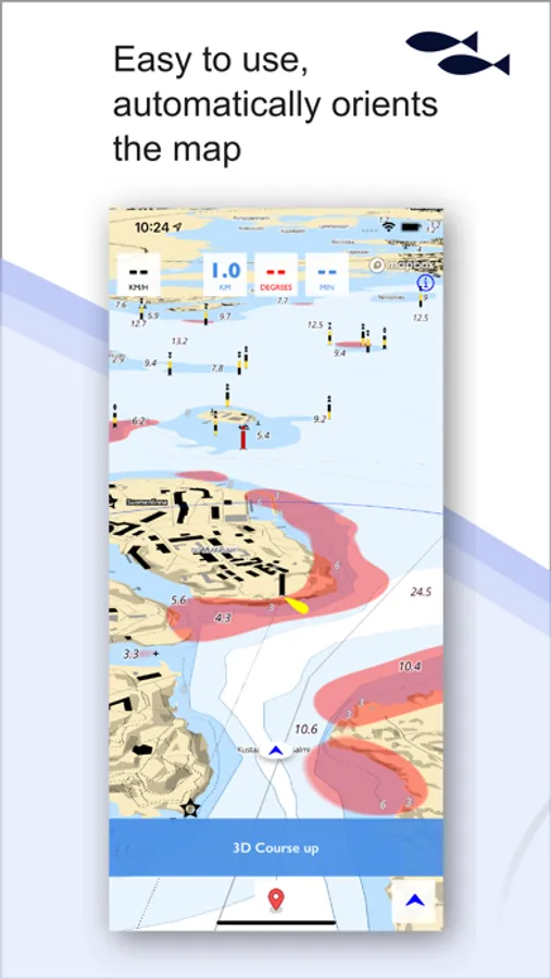 The app is easy to use on boats. It shows your location on the map and as you move, speed and direction. You can also see your travel time. As a new feature, you can now also plan a route on the map.
