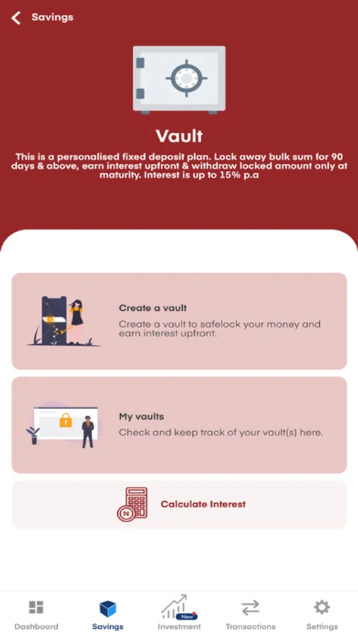 ● Vault: This plan is a personalised fixed deposit account. Savers can lock funds for a period of 90 days or more, and earn interest upfront immediately. Upon maturity of plan, withdrawal can be easily done.