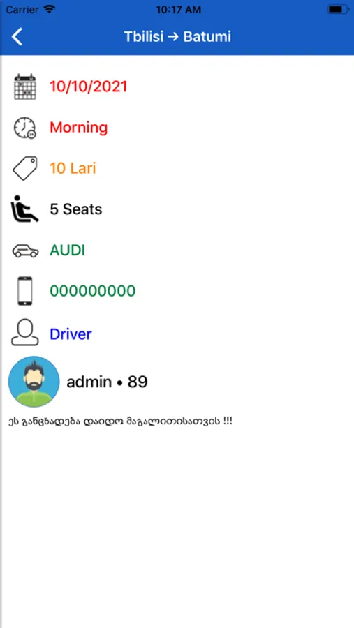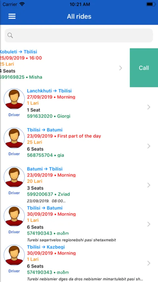 This app will allow users to check rides, add rides and manage their rides. App will allow to contact with drivers or passengers. App supports Georgian and English languages.