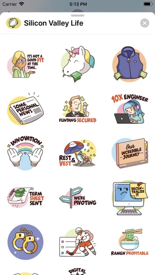 Every industry has it's funny quirks and memes. I've compiled some amusing ones from my industry (technology, and Silicon Valley) into a sticker set for iMessage! There's not a whole lot more to say, I did this because I thought it would be funny and I hope you find it funny too: we've got golden handcuffs, unicorns, and more.