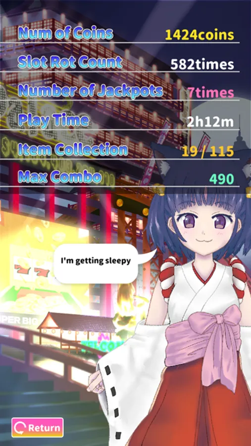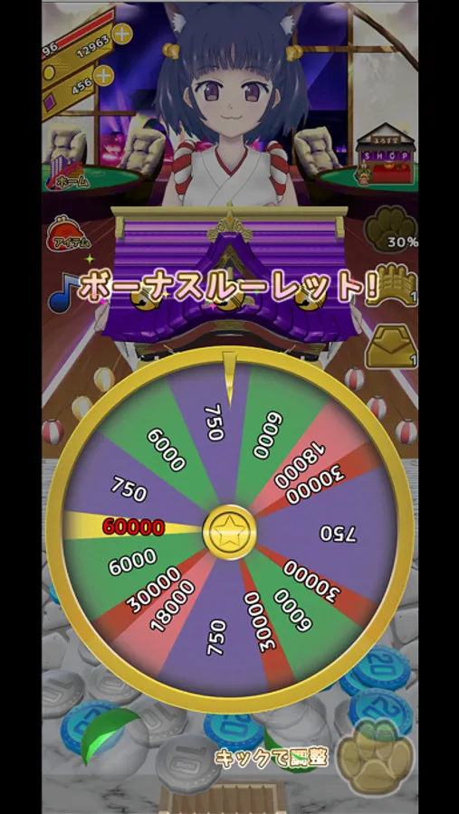 The slot machine will activate when a coin you've inserted finds its way into the money box at the front. Match up the slots and have a prize pop out from within the shrine. The "Bell" gives you 1x 15 coins, the "Lucky Mallet" gives you an item capsule, the "Purple Soul Stone" gives you 2x Purple Soul Stones, and "777" is a jackpot win. The small bell will be constantly hit for a certain amount of time if you match three 7s.