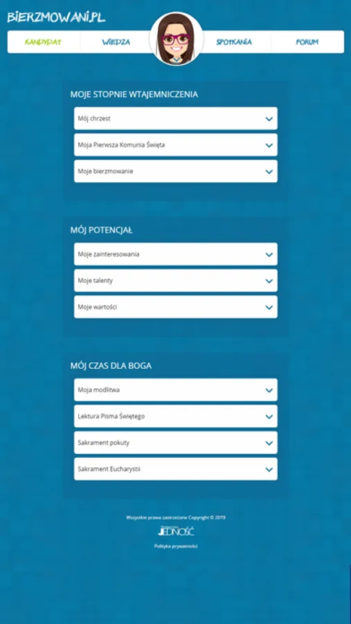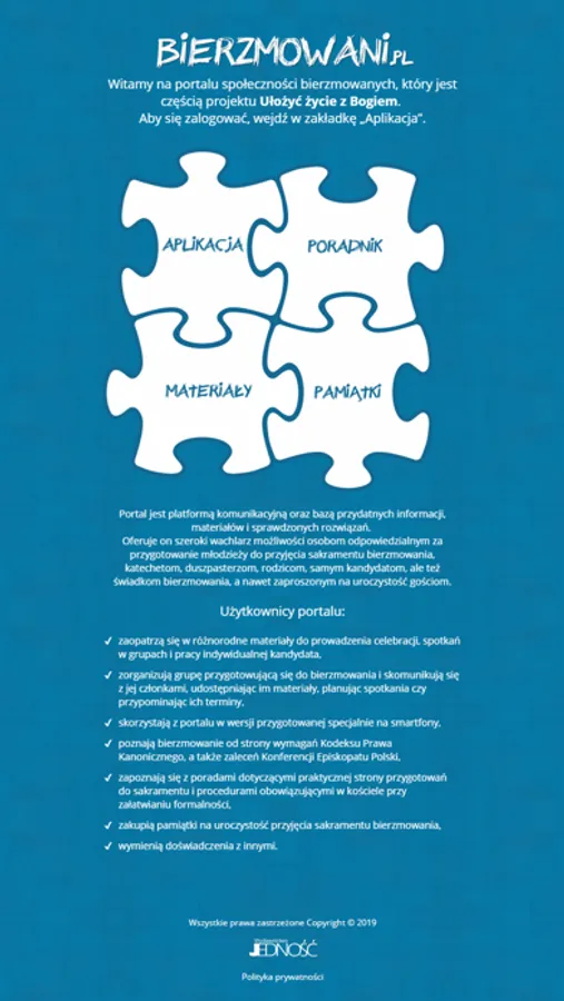 Kandydat do bierzmowania skorzysta w niej z osobistego dzienniczka, dzięki któremu zweryfikuje swoje postępy w przygotowaniach do sakramentu i zaplanuje dalsze działania. Znajdzie także zestaw pytań i odpowiedzi obejmujących wiedzę na temat wiary katolickiej, którą powinna znać osoba przyjmująca sakrament dojrzałości chrześcijańskiej, oraz materiały na spotkania w grupach: fragmenty Pisma Świętego, modlitwy i najważniejsze treści. Będzie mieć również możliwość rozmawiania na forum z animatorem i innymi kandydatami ze swojej grupy.