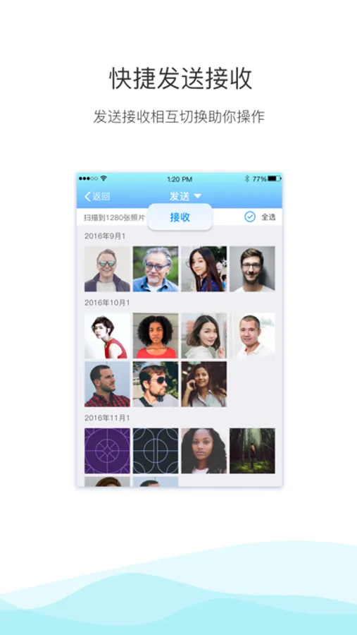 手机清理完无效数据瘦身后,然后进行数据传输,爱飞梭手机搬家支持图片,视频,通讯录,日程,提醒事件的传输,一键直连,快速传输。