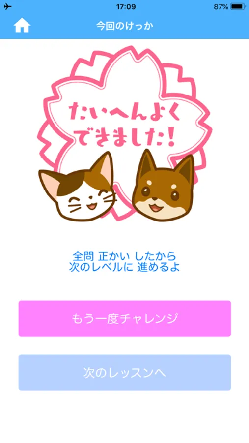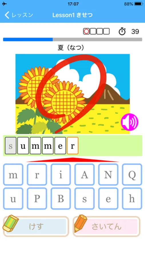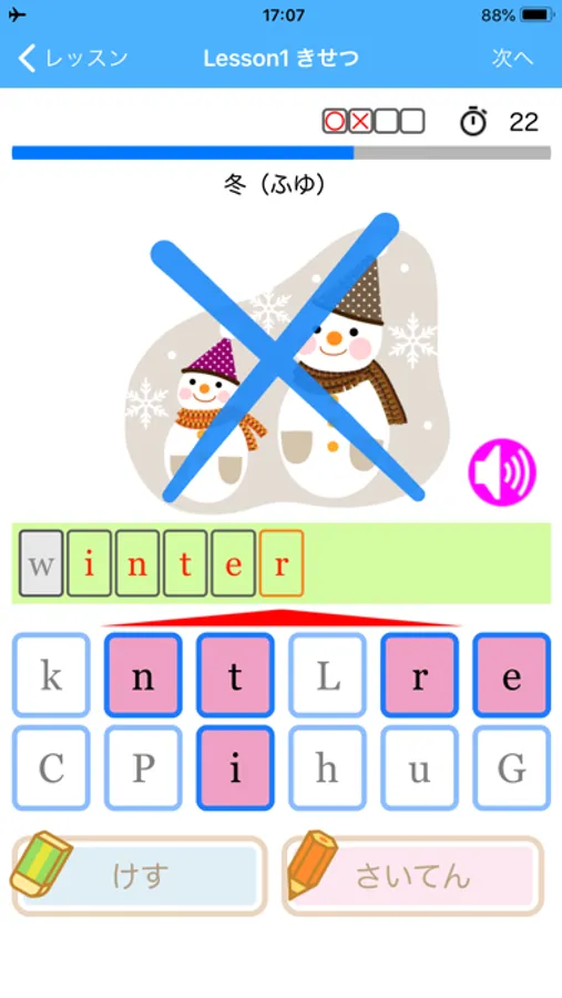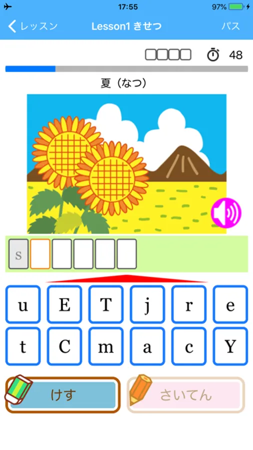 ・[レッスン]機能では、英単語帳で勉強した単語の確認テストができます。各レッスンで出題される問題を全て正解すると次のレッスンに進めます。サポートとして英単語の先頭の文字だけ最初から表示しています。分らないときは「パス」、間違ったときには「こたえ」をタップすると正解が表示されます。