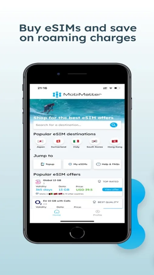 Discover the best eSIM options and cheap deals for unmatched connectivity with MobiMatter - the premier one-stop shop for mobile telecom services. Compare and purchase the best mobile offers by telecom operators worldwide.