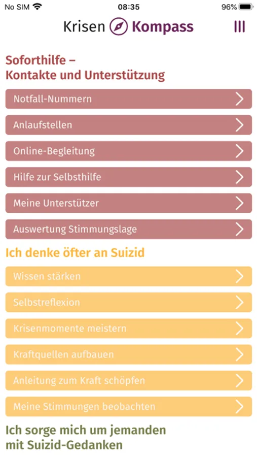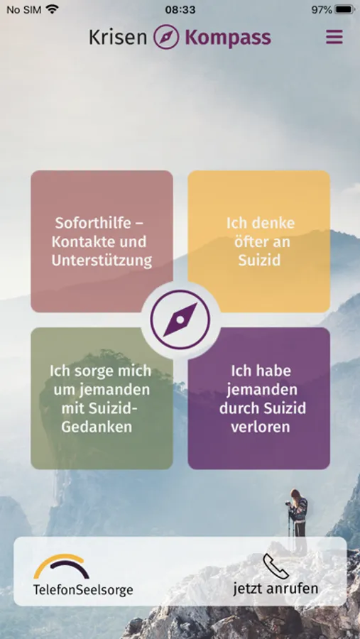 Mit der Krisen Kompass App will die TelefonSeelsorge in Deutschland Kindern und Jugendlichen, Frauen und Männern ein Instrument zur Krisenbewältigung an die Hand geben. Das Ziel ist, über Suizidgedanken, Suizide und ihre Folgen zu informieren, Ressourcen und Werkzeuge der situativen Bewältigung zur Verfügung zu stellen.
