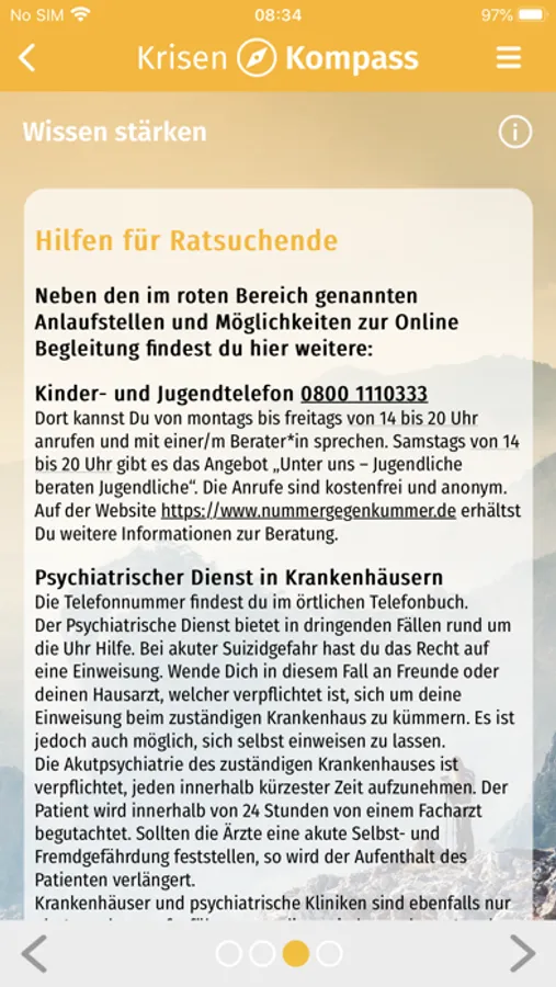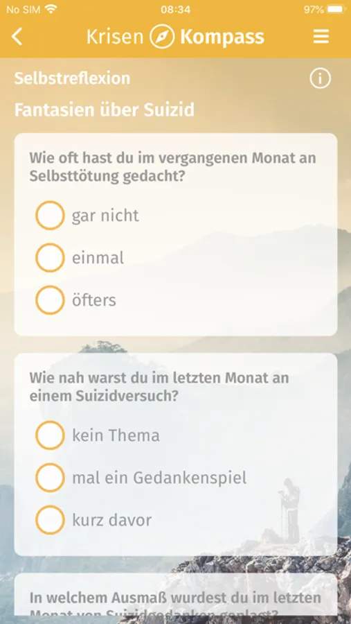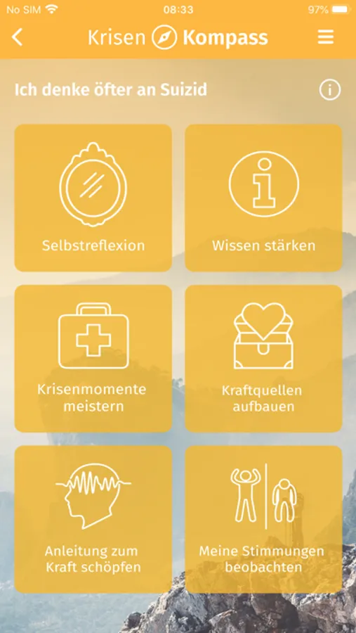 • Im gelben Bereich finden Suizidgefährdete Informationen, Hilfsangebote und Möglichkeiten zur Selbsteinschätzung und zur Selbstbeobachtung. Im „Notfallkoffer“ finden sie Hilfestellungen zu Strategien, wie sie akute Krisen bewältigen können.