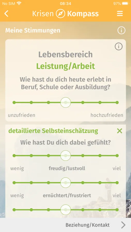 In einer Art „Stimmungsbarometer“ können Betroffene ihre Gedanken und ihre Gefühle in den Lebensbereichen Leistung/Arbeit, Beziehung/Kontakt, Geist/Werte und Körper/Sinne über einen längeren Zeitraum beobachten und in einer Grafik auswerten. Diese kann als PDF exportiert werden und z.B. in der Therapie oder Beratung genutzt werden. Damit kann die App eine wertvolle Hilfe für die Kooperation zwischen Unterstützern und Betroffenen sein.
