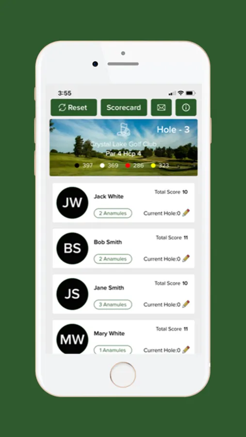 The app keeps interactive live tracking of all the Anamules and scores for each player. The app displays course information including hole number, yards, par, and handicap. You can invite multiple players within the app and each person can see the live scoring updates as they happen on their phone if they have the app downloaded as well. Each player can edit and view scores throughout the round.