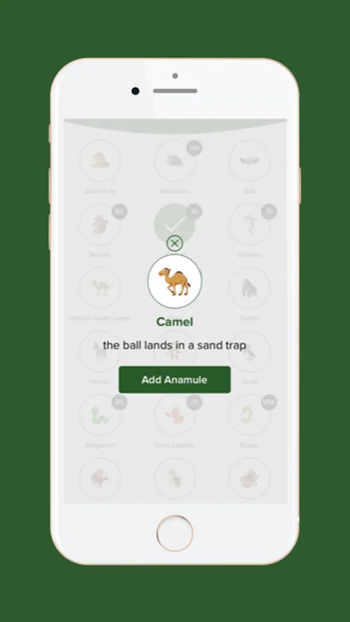 The game of Anamules is simple and fun to play. For certain shot related outcomes there are different “Anamules” associated with the shot. For example, if a player swings and misses the ball completely that player gets a Bat. If a player loses their ball in the rough, they get a Quail. A shot in the sand trap gets them a Camel. All in all, there twenty Anamules in the game.