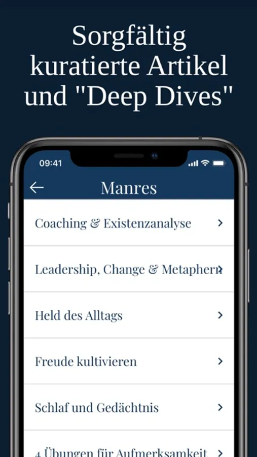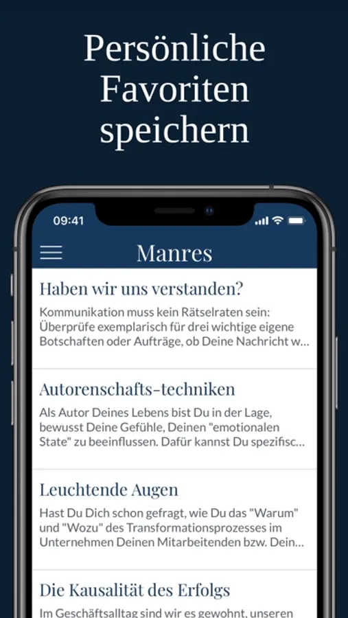 Kunden der Manres finden in der App ein reichhaltiges Angebot an Inhalten vor, die genau auf die Themen zugeschnitten sind, die sie in Workshops und Trainings der Manres kennengelernt haben. Sie wurden eigens von den Transformationsexperten der Manres für Sie entwickelt. Je nach erarbeiteten Themen werden genau die Themen freigeschaltet, die für sie individuell Sinn ergeben. Kleine "Refresher" stellen noch einmal die Kernbotschaften unserer Modelle heraus. Reflexionsübungen laden zum Nachdenken über sich selbst ein. In unseren "Challenges" stellen wir Ihnen Herausforderungen für den Alltag, um in bestimmten Gebieten aus Ihrer Komfortzone zu kommen und etwas Neues zu lernen. Wir helfen Ihnen damit, den Raum zwischen den Workshops und anderen Veranstaltungen sowie Ihrem Alltag mit Leben zu füllen und die erworbenen Kenntnisse direkt umzusetzen.