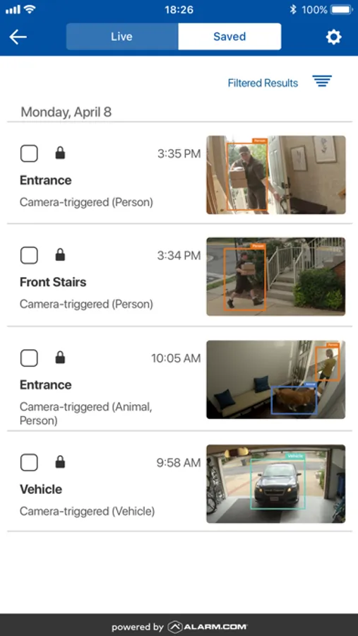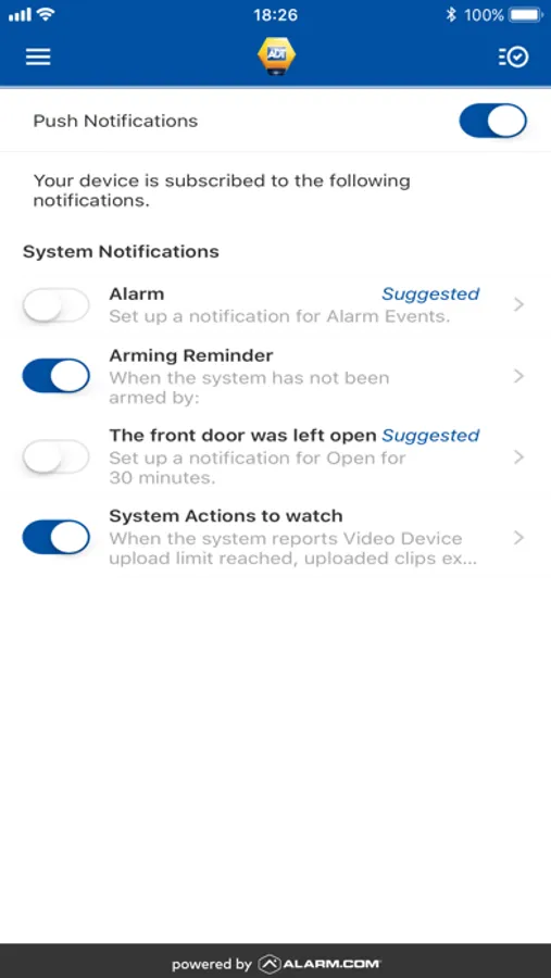 ADT will notify you with a Security or Safety alert, when the status of your device changes. For example, when the alarm is activated or the door/window contact is triggered or the smoke detector goes off so you are immediately alerted.