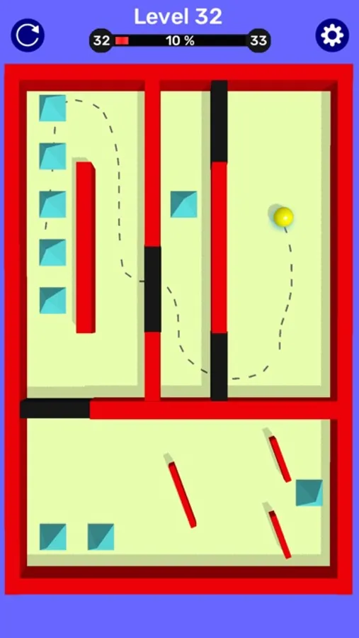 The ball should not touch any red barriers. So do not draw over a red lines or red barriers, because the ball will follow that path and crash into the red obstacles.