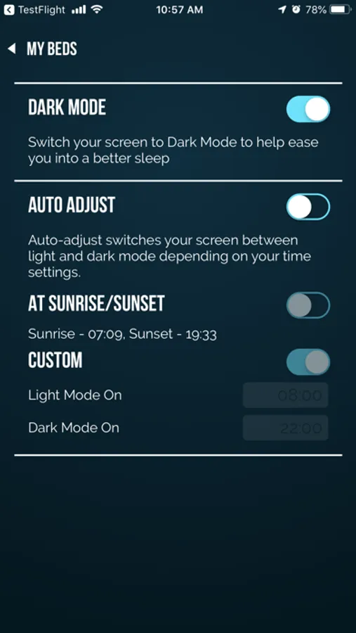 - Screen settings include dark mode and auto adjust with sunrise-sunset option when location permissions are allowed