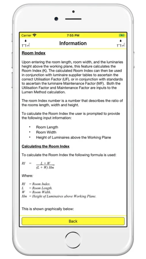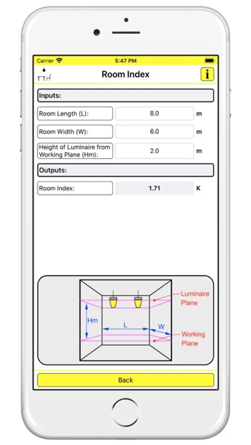 Upon entering the room length, room width, and the luminaries height above the working plane, this feature calculates the Room Index (K).