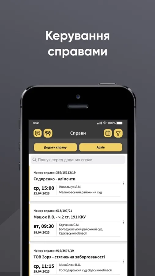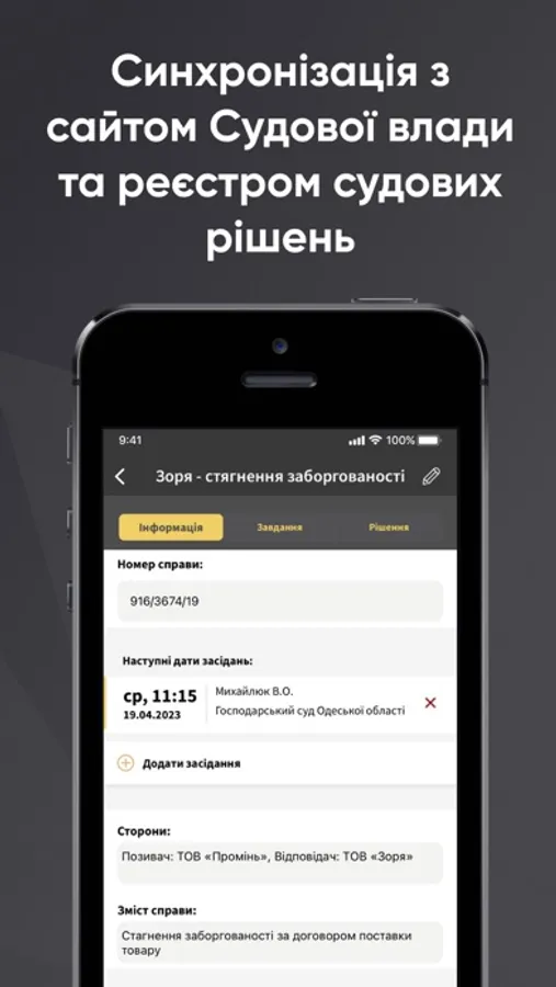 Додаток автоматично взаємодіє з основними державними реєстрами (сайт Судової влади України та Єдиний державний реєстр судових рішень), а також дозволяє сумісно з Вашими партнерами / працівниками / помічниками здійснювати зручне управління всіма Вашими судовими справами та юридичною практикою з будь-якої точки світу