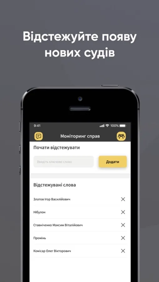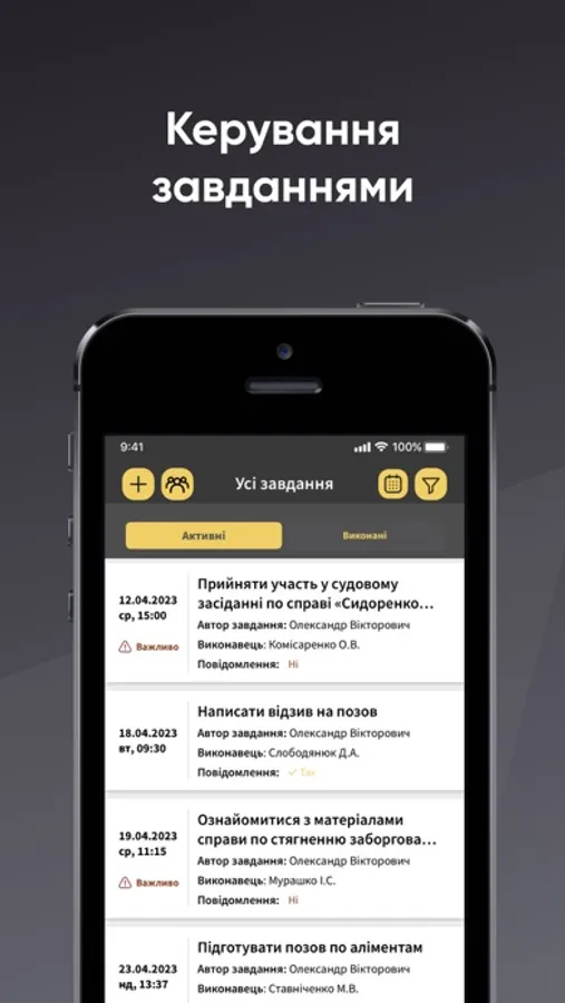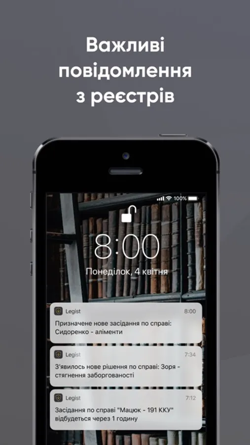 - Отримуйте повідомлення на свій телефон про: появу нових судових засідань, у яких Ви приймаєте участь; появу нових судових рішень; появу нових судових справ, стороною у яких є Ваші клієнти / контрагенти / опоненти; нагадування про необхідність прийняти участь у засіданнях; виконання завдань Вашими помічниками та багато інших.