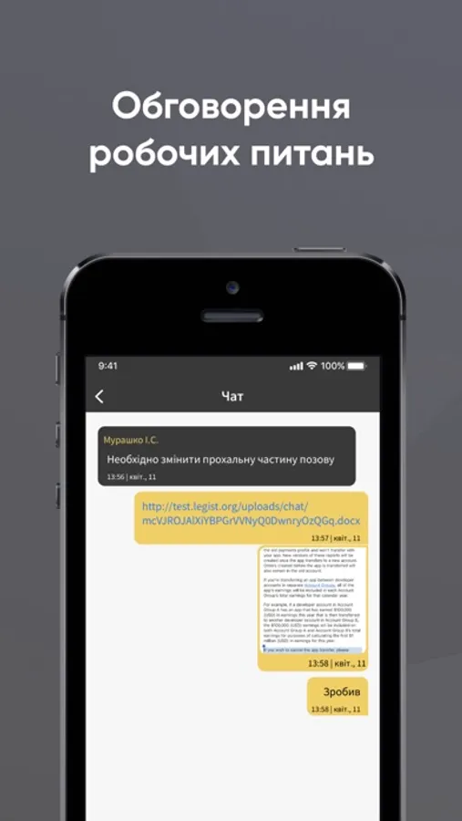 - Дозволяє ставити завдання іншим учасникам Вашої компанії, отримувати звіт про їх виконання та обговорювати робочі питання в чаті.