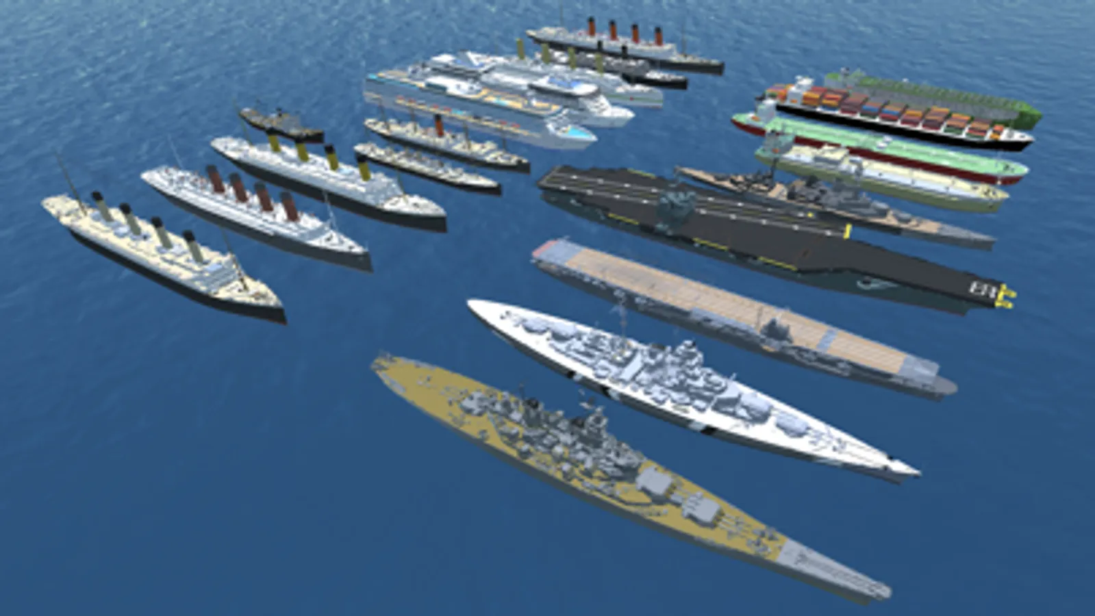 25 high-detailed ships, included passenger ships, cruise liners, cargo ships, battleships and aircraft carriers, from historical steam ships of 19th century till modern nuclear.